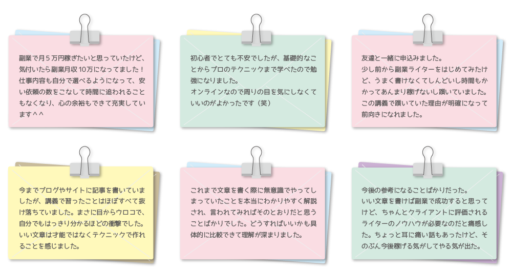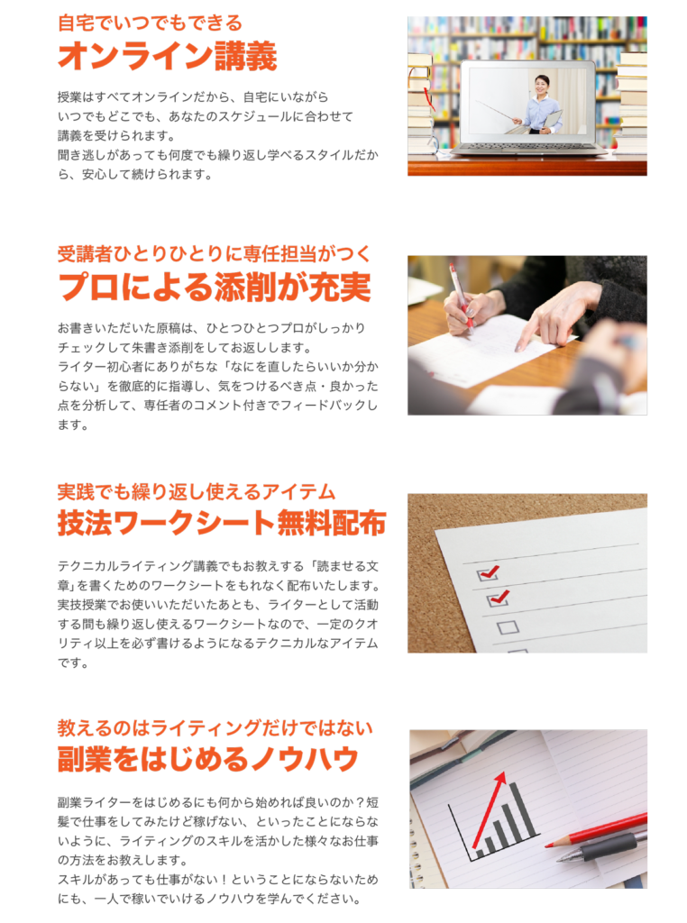 他のオンライン講義・スクールでは、文章の書き方に関する支援が中心で、副業としての稼ぎ方や考え方を重視しておりません。