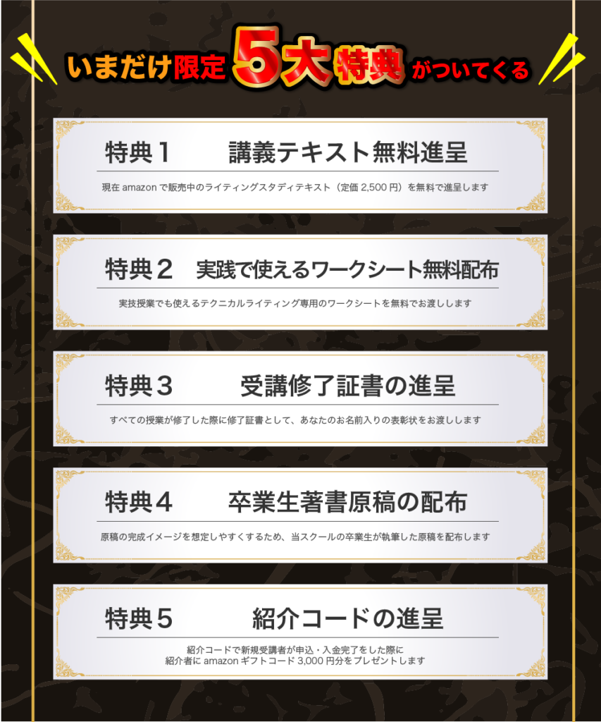 | 第4回〜第5回 | テクニカルライティングで売れる文章を生み出す ・黄金フォーマット 〜「何を書けばいいか分からない」からの脱却〜 ・能力不足を打開するフォーマットの使い方・効果 ・テクニカル構成法 〜原稿作成に時間が掛からなくなる方法〜 ・ストーリー構成の組み立て方 〜より魅力的に書くコツ〜 ・稼げるライターになるために必要なこと |
